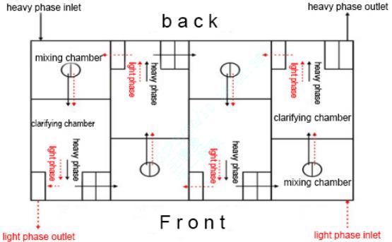 The work of mixer settler includes two processes, namely the mixing mass transfer process and the two-phase separation process. The mixing is completed by the rotation of the agitator, and the separation is completed by gravity. Two liquids with different densities enter the mixing chamber from the feed inlet, and the mixing and mass transfer process is completed through the agitating of the agitator. The suction force of the impeller drives the liquid of the mixed phase to rise, and it overflows into the clarification chamber through the overflow baffle of the mixing chamber. The two mixed phases are separated by gravity in the clarification chamber. In the clarification chamber, the height of the two-phase liquid level is controlled by adjusting the height of the heavy phase adjustment tube (with holes on top of the heavy phase adjustment tube), so that the heavy phase flows out of the heavy phase discharge tube, and the light phase flows into the light phase collection chamber from the light phase weir, and then discharged from each outlet. Please see the flow chart as following: